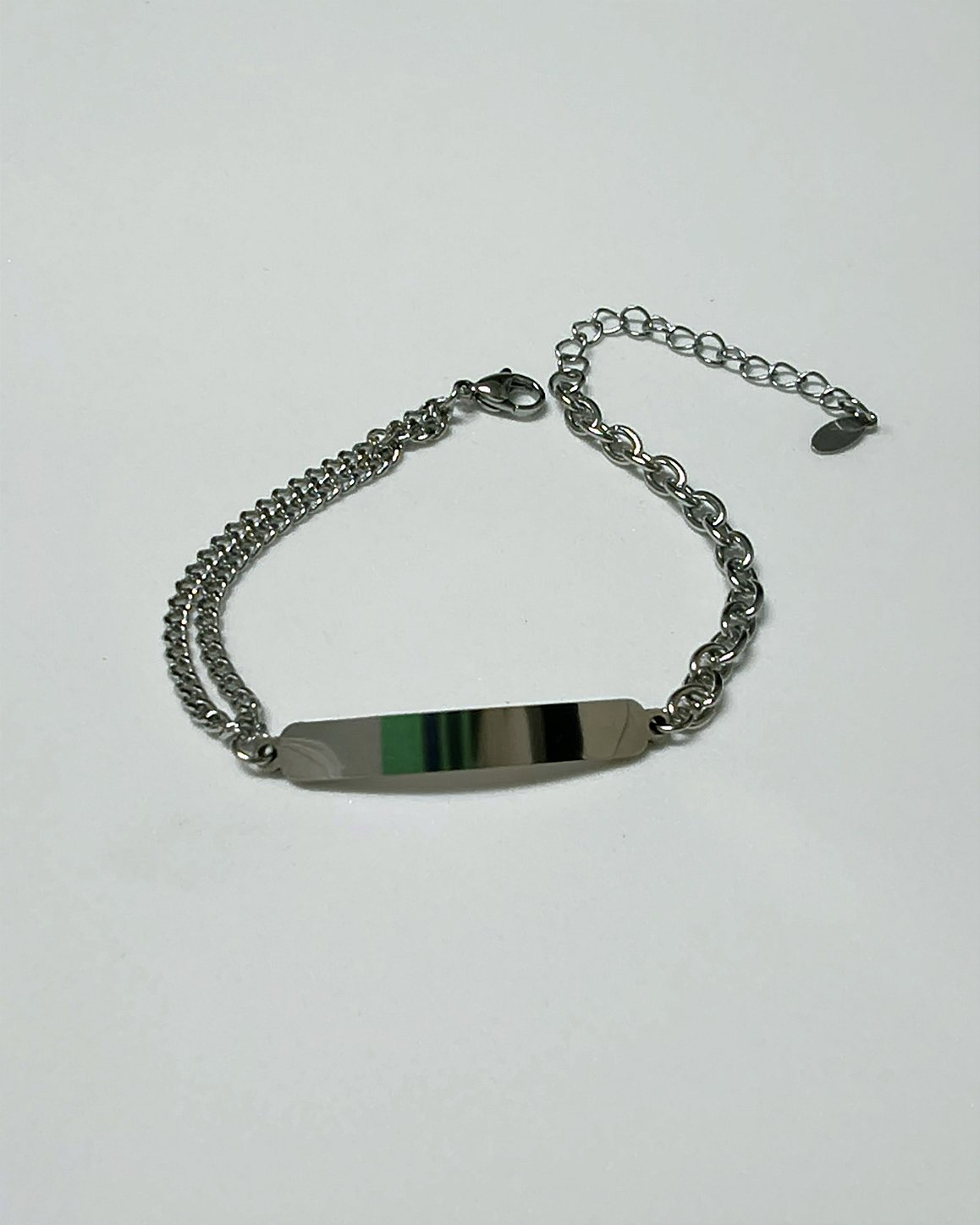 A pulseira é feita em aço inoxidável prateado, com design de placa lisa na frente e corrente ajustável para melhor conforto. O fecho tipo lagosta oferece segurança na fixação. Produto indicado para quem gosta de acessórios versáteis que podem ser usados no dia a dia ou em ocasiões informais.